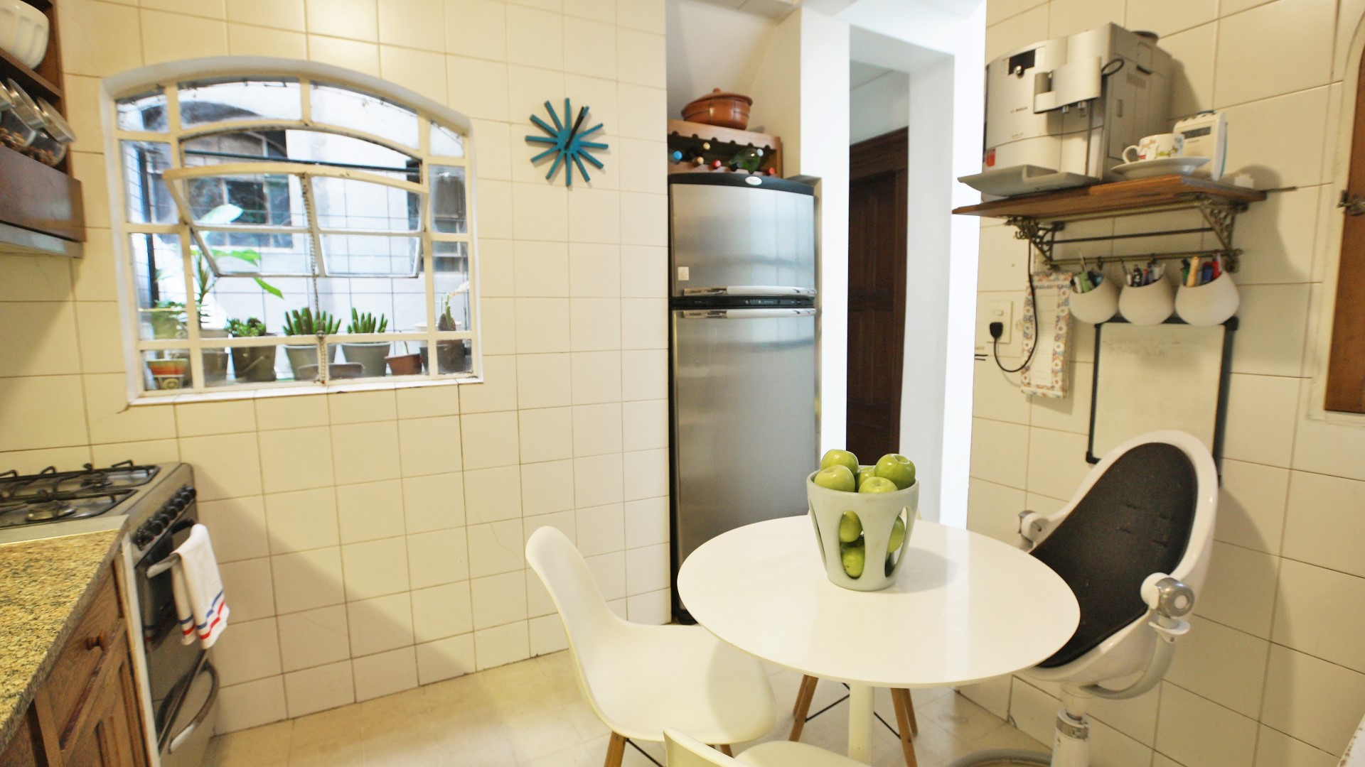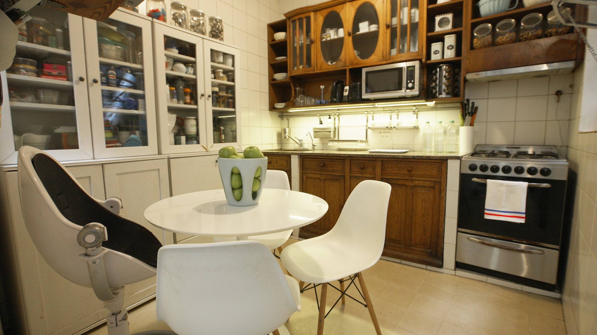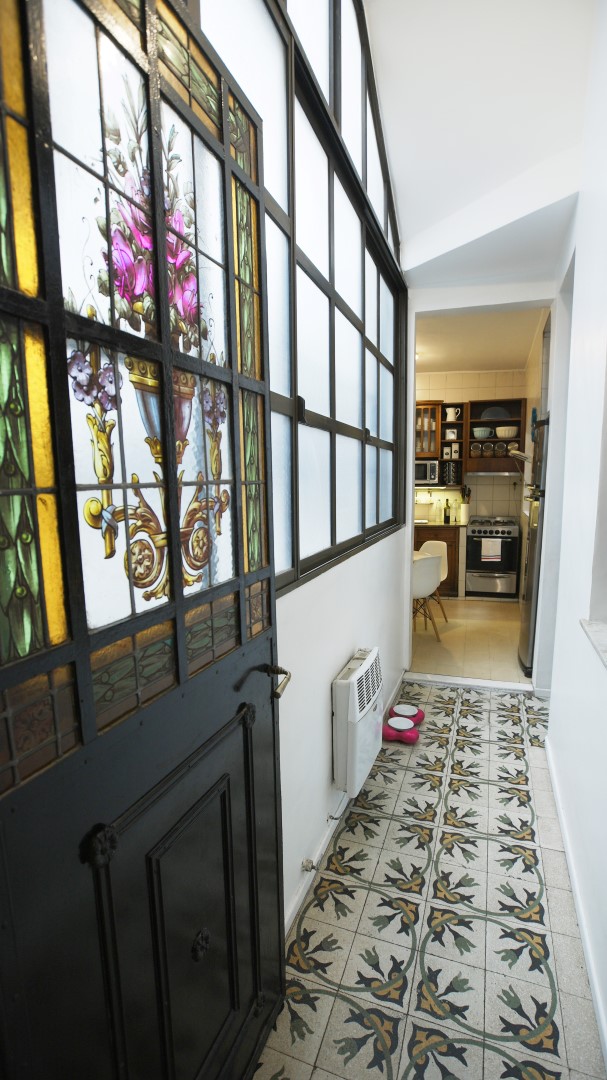 Por la hermosa puerta de vitreaux antigua pasamos al pasillo con ventanal y pisos originales calcáreos e instalación de tiro balanceado, llegando hacia la cocina con comedor diario, con dos ventanas a los patios internos de la casa, con mueble antiguo aparador de roble de Eslavonia bajo y sobre mesada. Spar eléctrico de muy buen diseñado integrado respetando las líneas originales del mueble y luces led bajo el mueble sobre mesada. Instalación de AA.