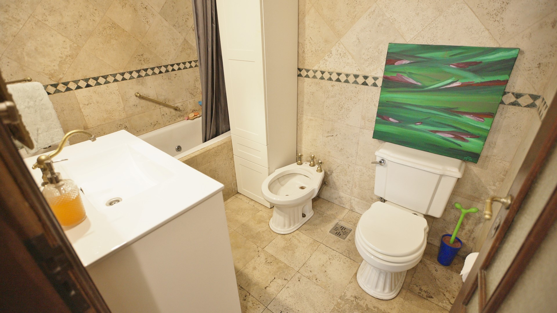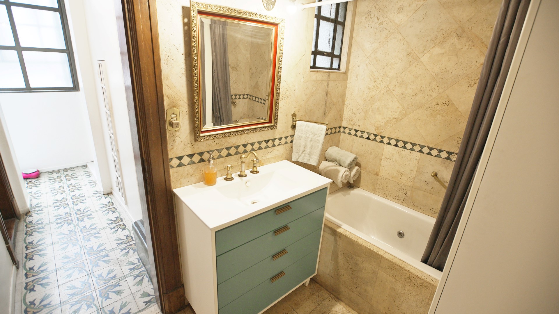 Baño Completo con bañera con piso y paredes de mármol con ventana al patio interno y sistema de aireación eléctrico con accesorios de bronce antiguos.