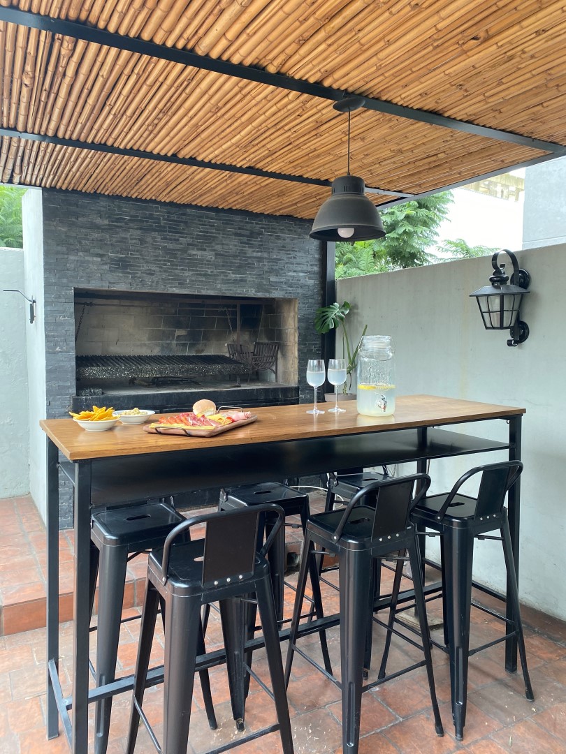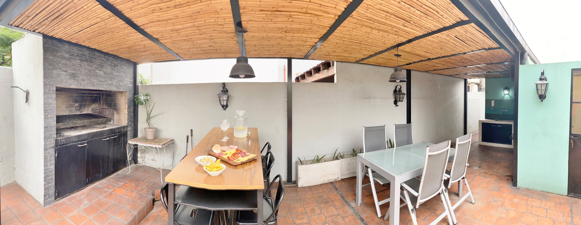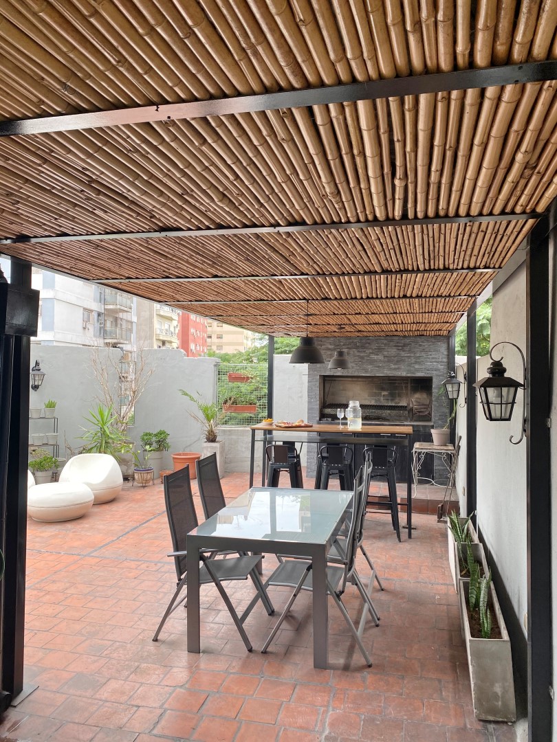 Por escalera accedemos a la terraza de 70 m2 a pura luz e inmejorables medidas con zona de parrilla, comedor, living, pileta lava platos, Habitación de Servicio y Baulera. Con Pérgola de excelente diseño de hierro de 9m de largo por 2,80m de ancho, con techo inclinado oculto, aislación térmica y detalles de cañas de bambú e instalación eléctrica. Parrilla de gran tamaño con puertas de hierro y frente de piedra gris oscuro e instalación de luz interna. Pileta lava platos con puertas bajo mesada de hierro.